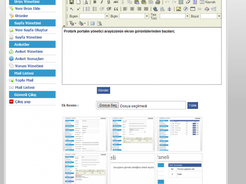 Protürk portalın yönetici arayüzünün ekran görüntülerinden bazıları;